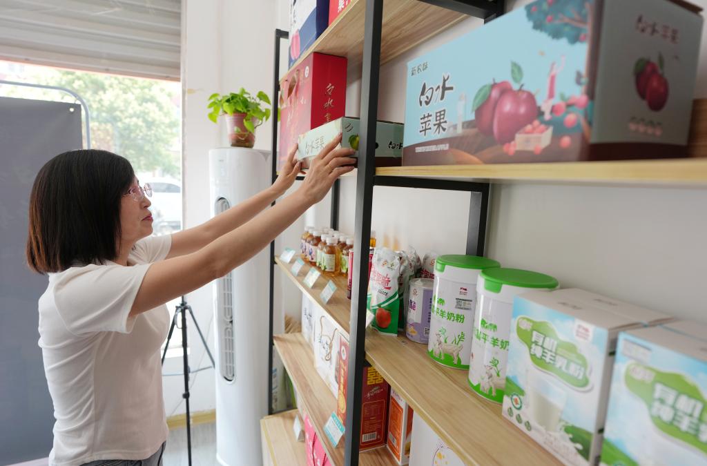 陝西省渭南市の白水県新農妹電子商務でリンゴの展示品を整理する職員。(6月10日撮影、西安=新華社記者/李一博)