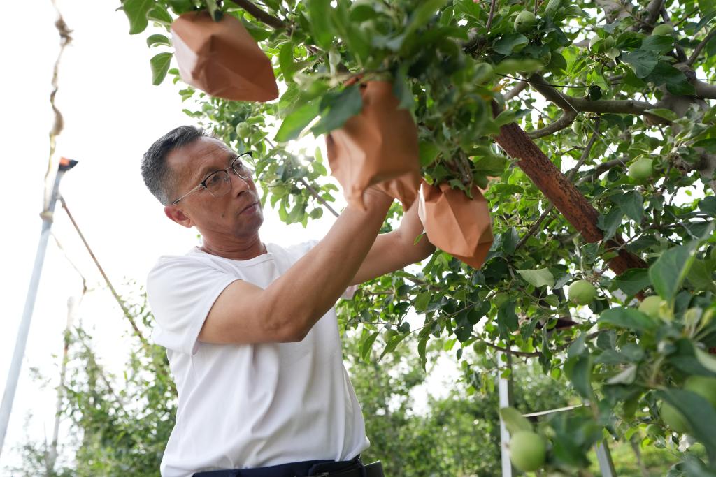 陝西省渭南市白水県林皋鎮にある果樹園でリンゴに袋をかける果樹農家、曹謝虎(そう・しゃこ)さん。(6月10日撮影、西安=新華社記者/李一博)