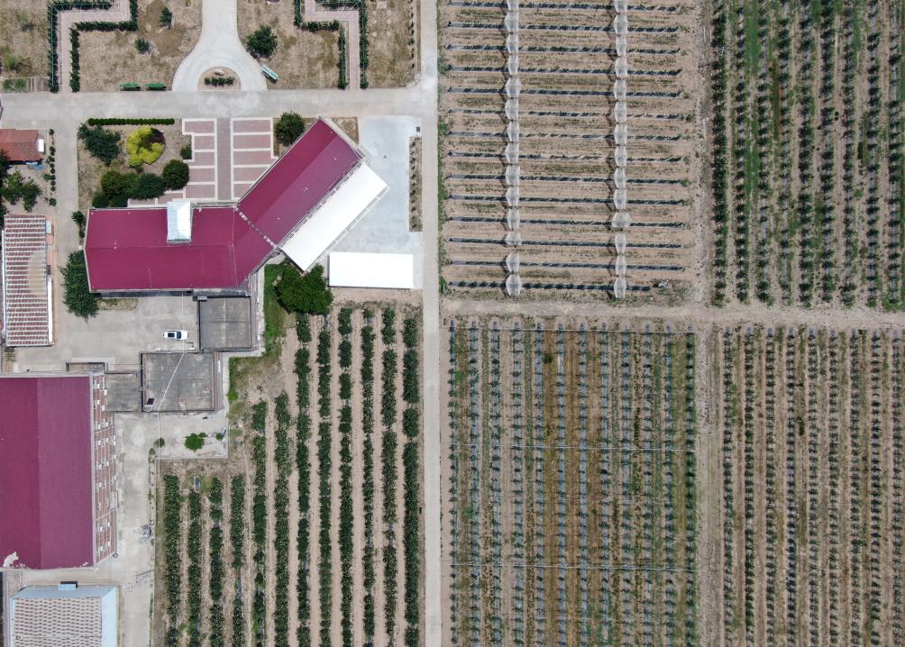 陝西省渭南市白水県にある西北農林科技大学の白水リンゴ試験ステーション。(6月10日、ドローンから、西安=新華社記者/李一博)