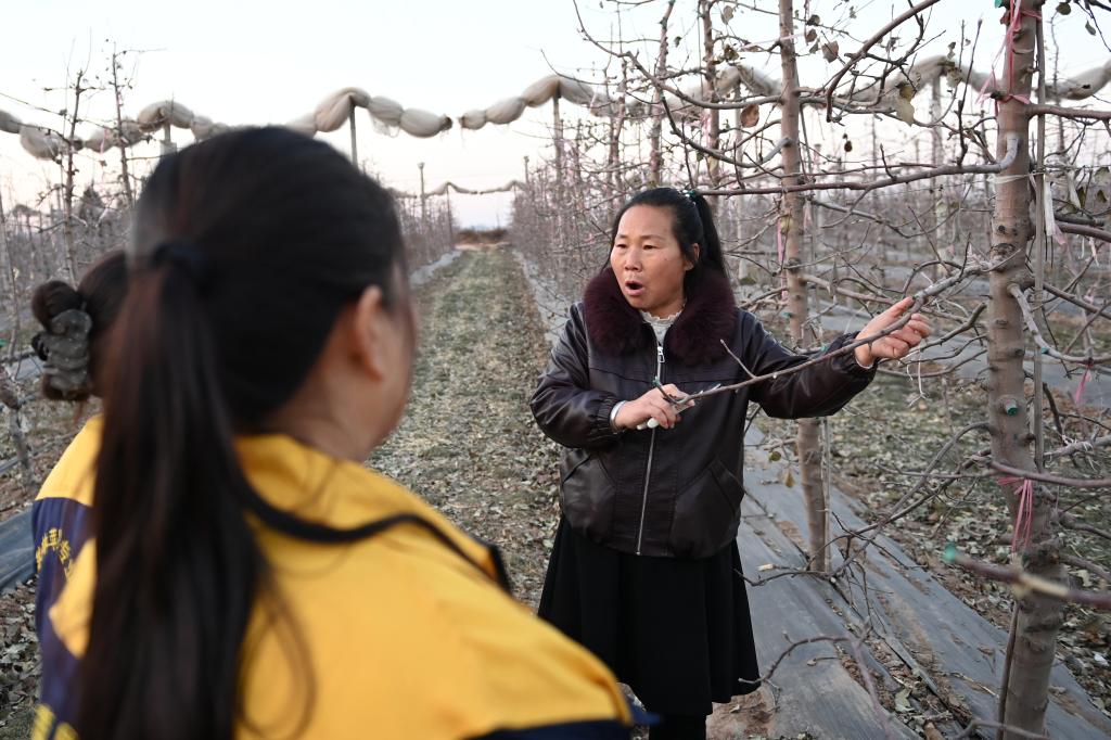 陝西省渭南市の白水県秋林リンゴ専業合作社の果樹園でリンゴの枝の剪定のポイントを指導する、同合作社の林秋芳(りん・しゅうほう)理事長(右)。(1月9日撮影、西安=新華社記者/李一博)