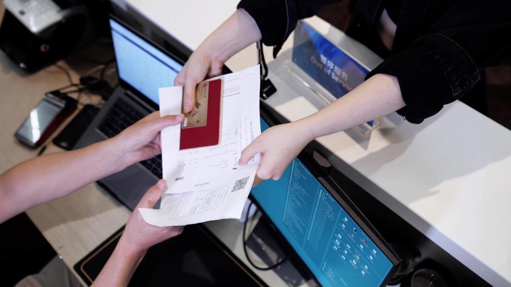 四川省成都市にあるIFSモールで「即買即退」の税還付手続きを行う外国人観光客。(成都=新華社配信)