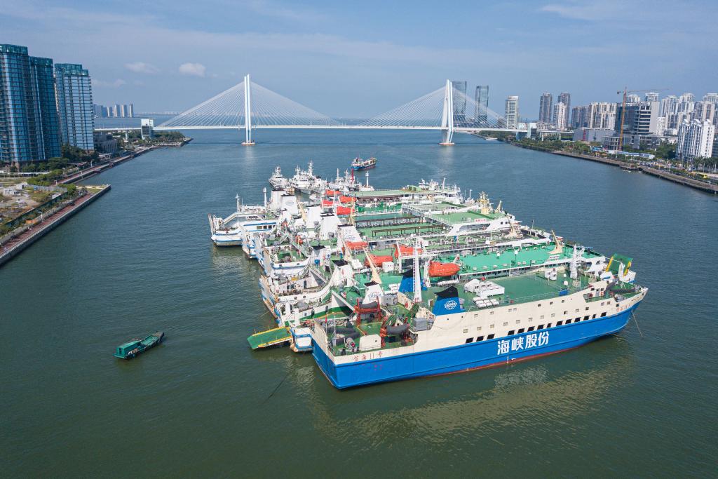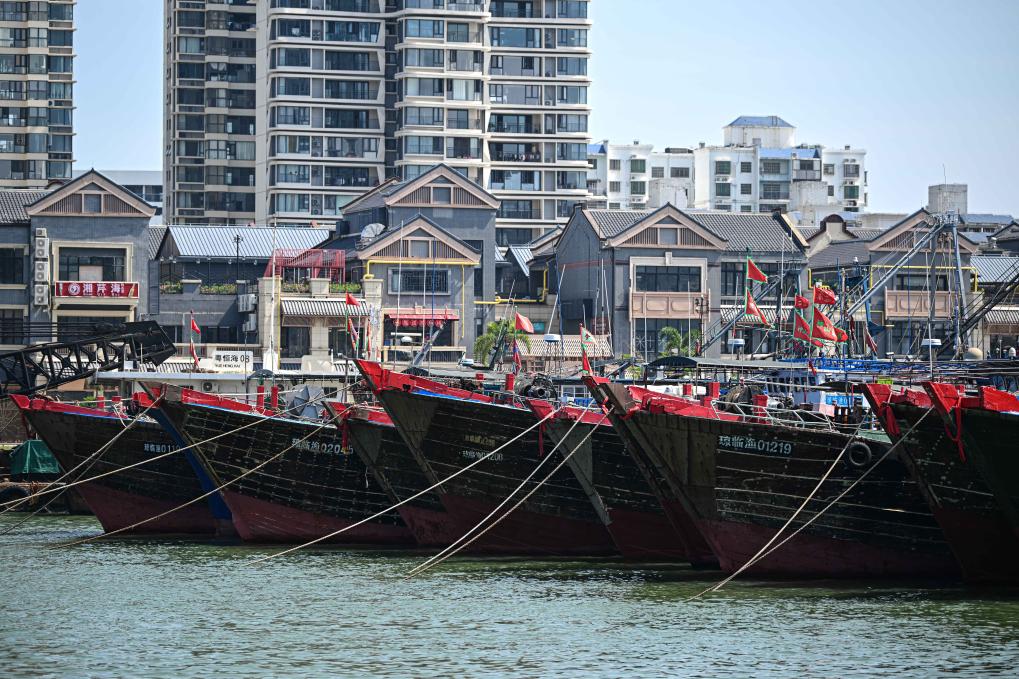 23日、海口市内の海口新港埠頭(ふとう)に停泊し避難する船舶。(海口=新華社記者/蒲暁旭)