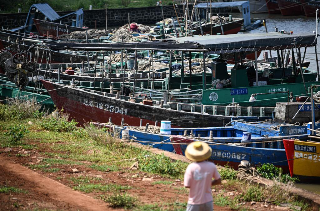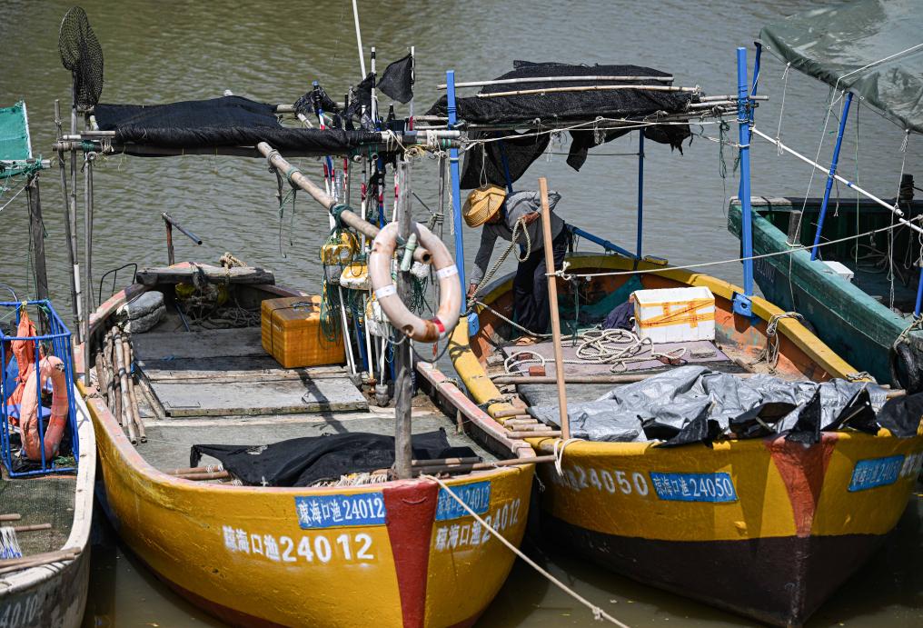 23日、漁船を海口市内の南渡江の支流に停泊させる漁民。(海口=新華社記者/蒲暁旭)