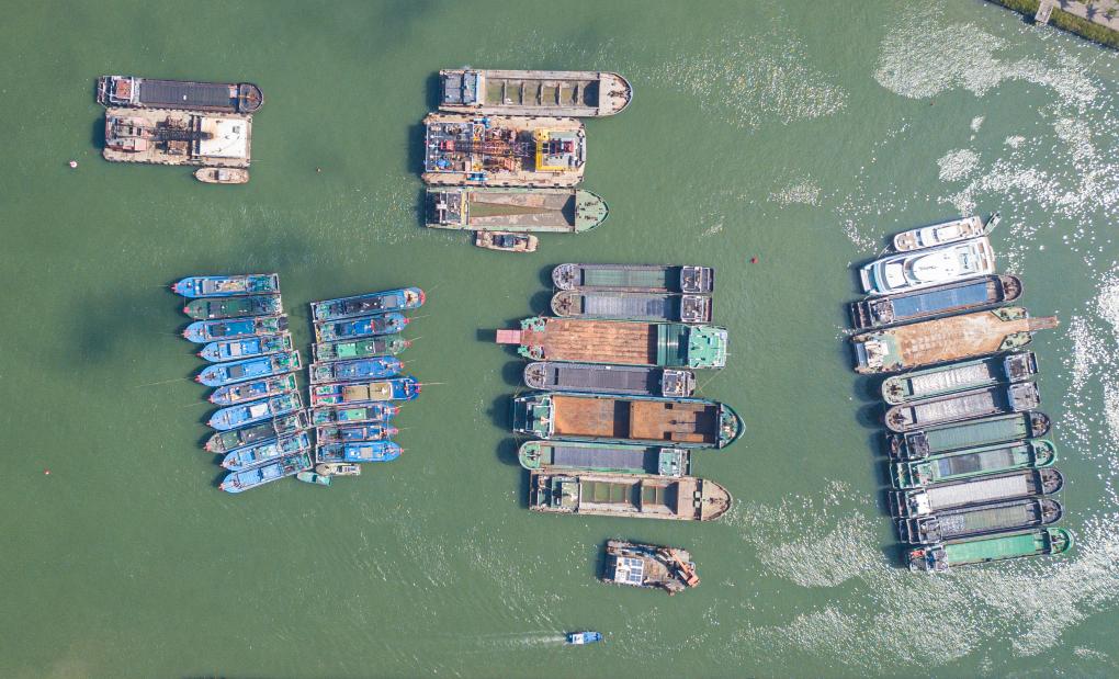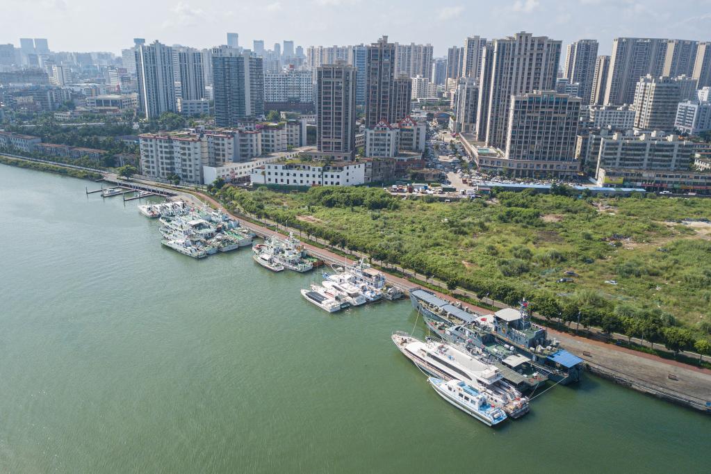 23日、海口市内の海口新港埠頭(ふとう)に停泊し避難する船舶。(ドローンから、海口=新華社記者/蒲暁旭)