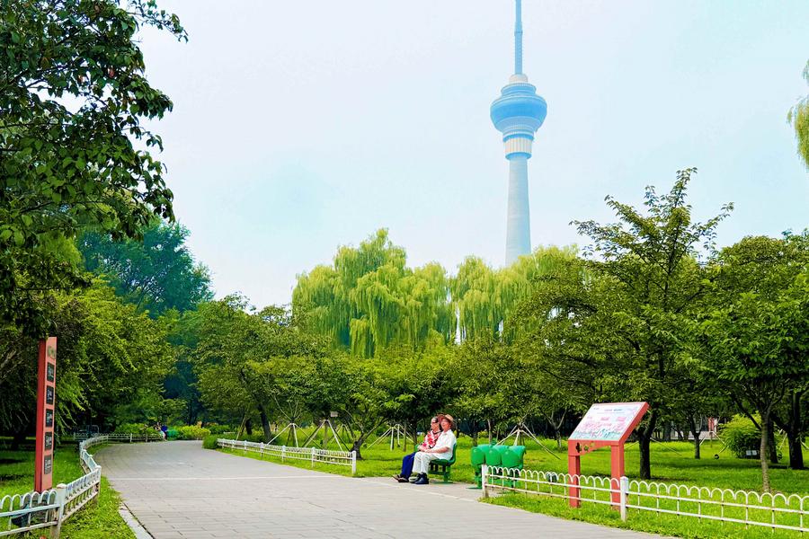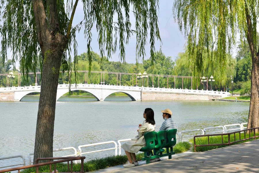 13日、北京市の陶然亭公園に設置された観覧席で休憩し湖の景色を楽しむ行楽客。(北京=新華社配信)