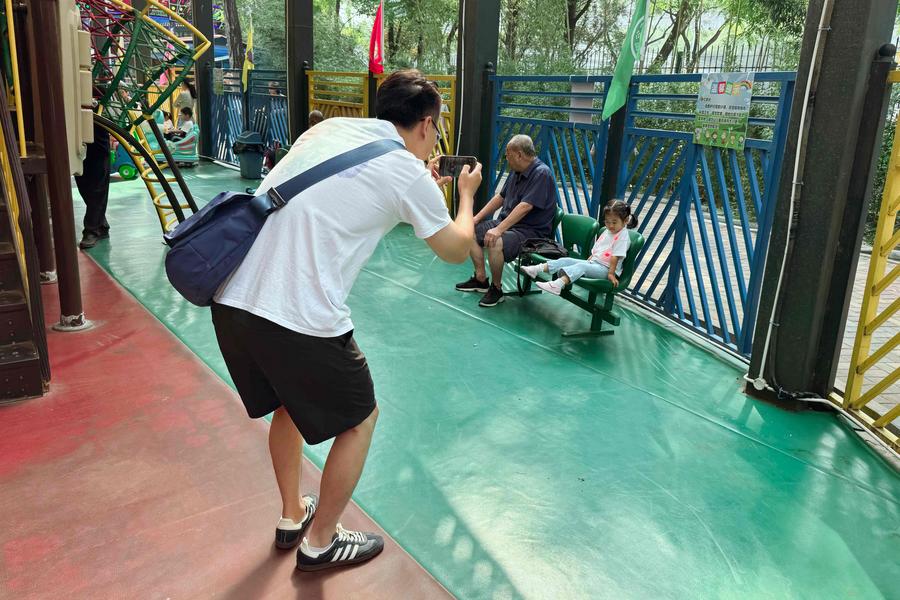 13日、北京市の紫竹院公園に設置された観覧席に娘を座らせ写真を撮る父親。(北京=新華社配信)