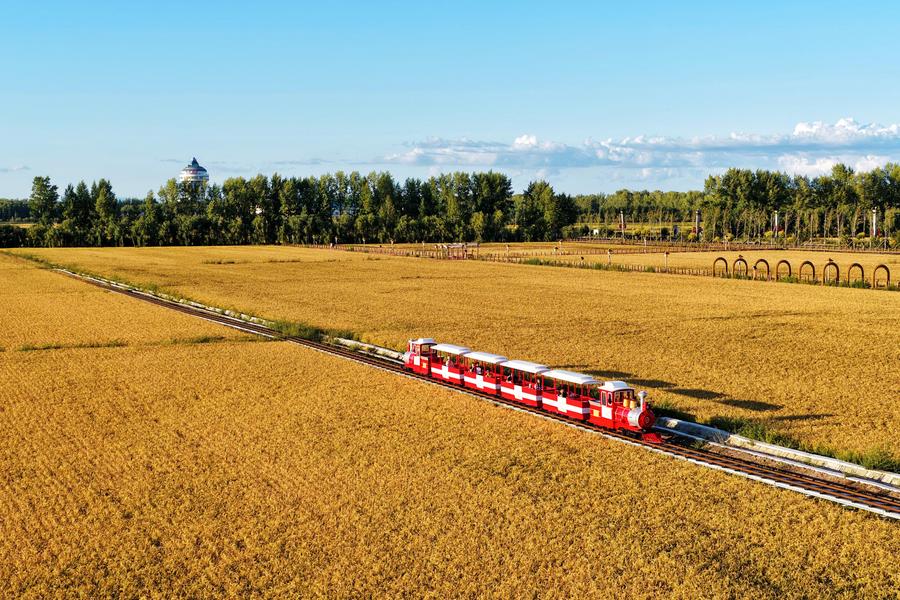 黒竜江省同江市の田園地帯を走る観光用小型列車。(9月6日、ドローンから、ジャムス=新華社配信/劉万平)