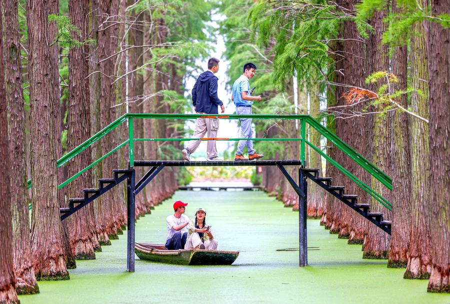 江蘇省揚州市の渌洋湖湿地公園で「水上森林」の景色を楽しむ観光客。(9月11日撮影、揚州=新華社配信/任飛)