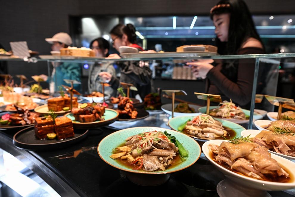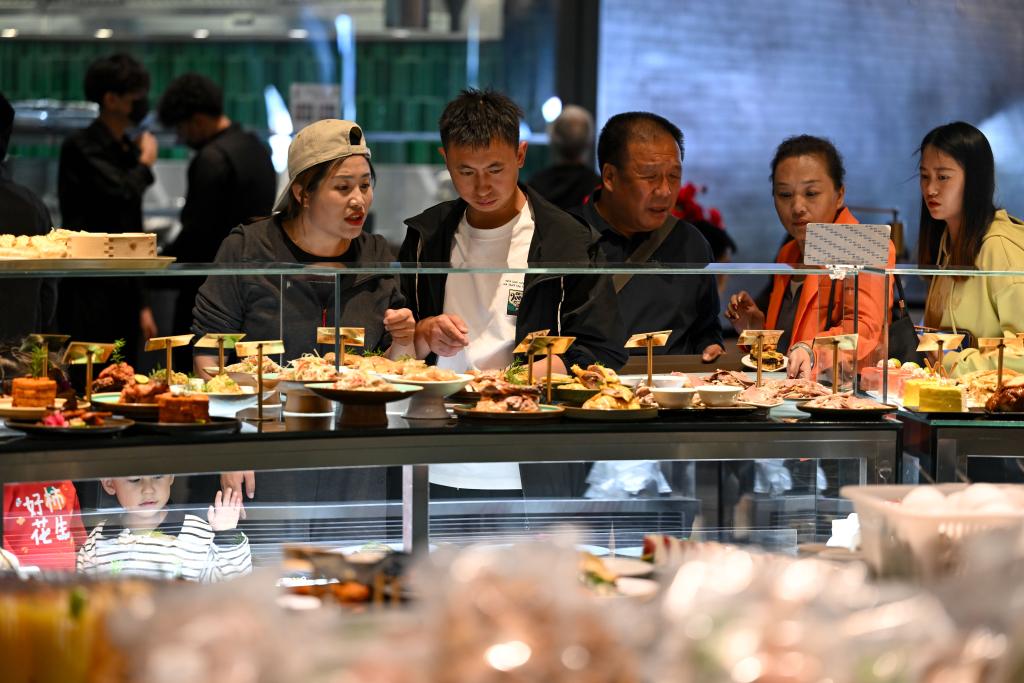24日、呉忠市の早茶店で料理や点心を選ぶ人たち。(呉忠=新華社記者/馮開華)