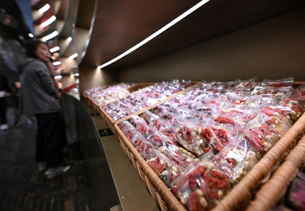 24日、呉忠市の早茶店で八宝茶を選ぶ人。(呉忠=新華社記者/馮開華)
