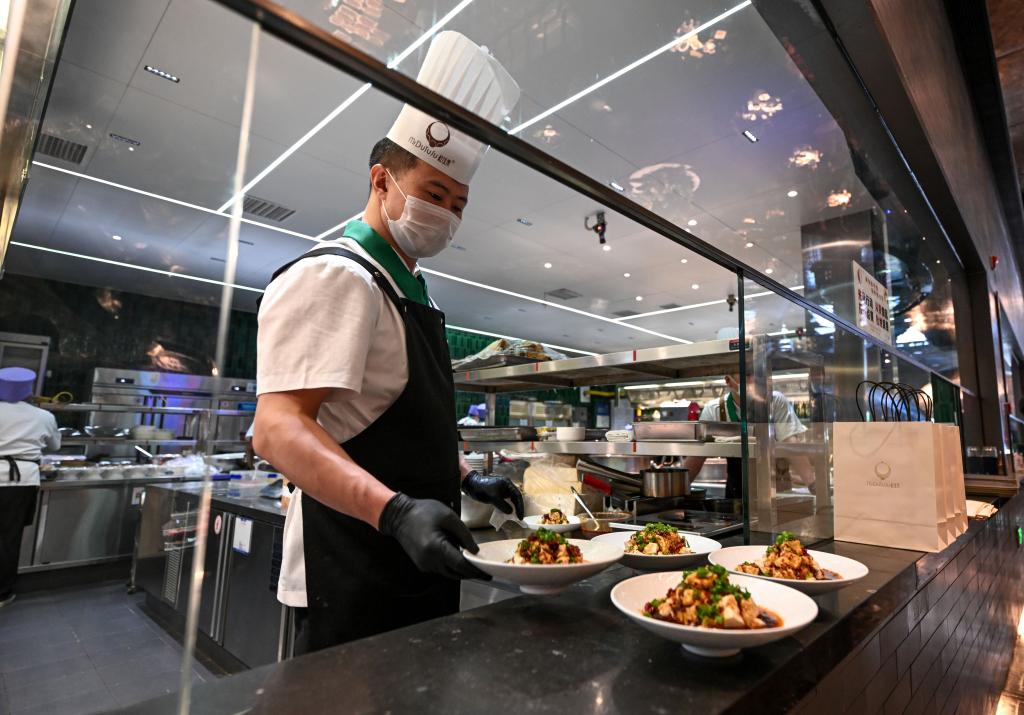 24日、呉忠市の早茶店で料理を出す料理人。(呉忠=新華社記者/馮開華)