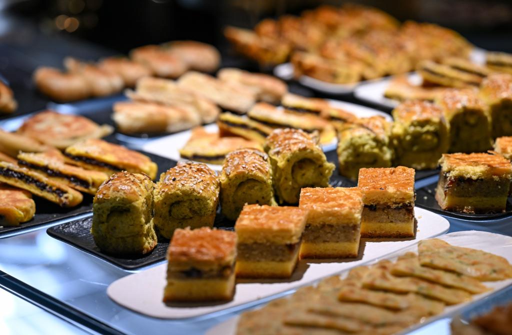 24日、呉忠市の早茶店に並ぶ小麦菓子。(呉忠=新華社記者/馮開華)