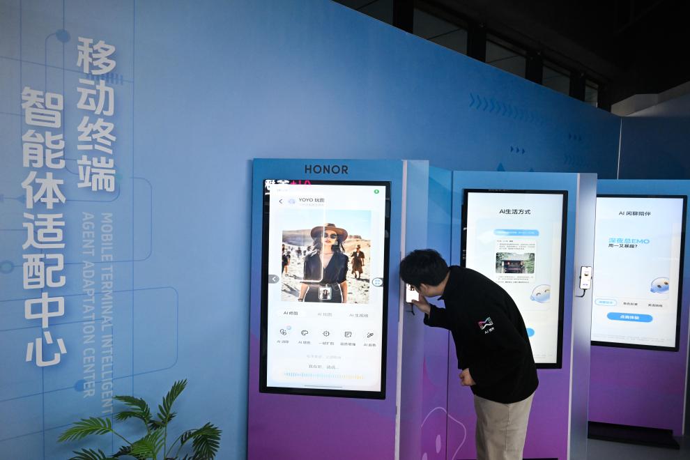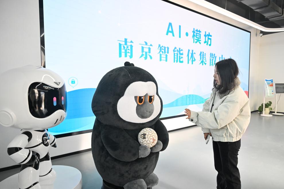 南京人工知能生態街区内の「AI・模坊」南京智能体(インテリジェントエージェント)集散センターで、スマートモバイル端末と交流するスタッフ。(12月4日撮影、南京=新華社記者/季春鵬)