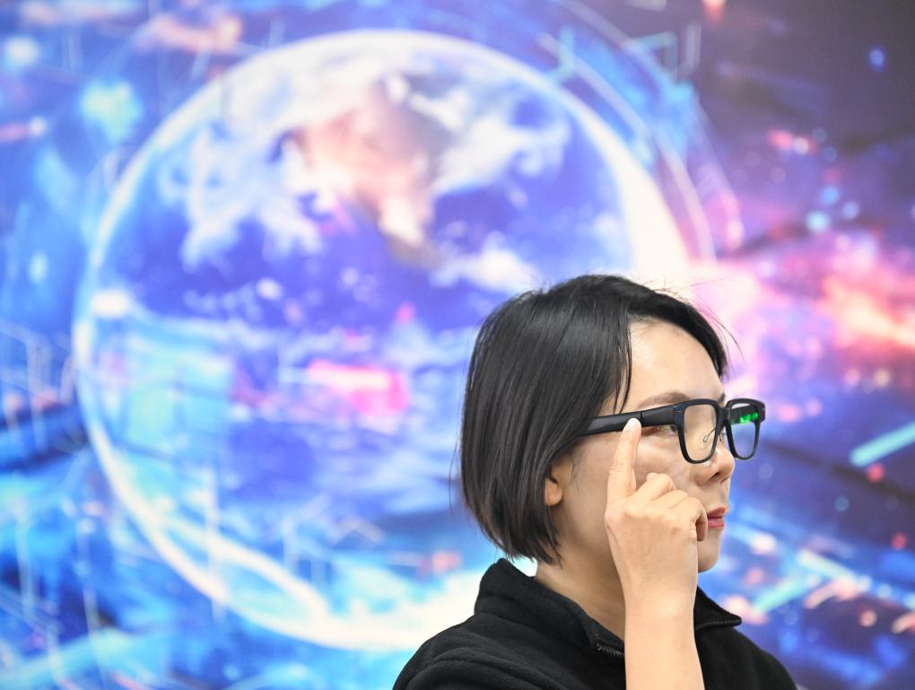 AI・鏡界-南京人工知能生態街区で、AIグラスを見せるスタッフ。(12月4日撮影、南京=新華社記者/季春鵬)