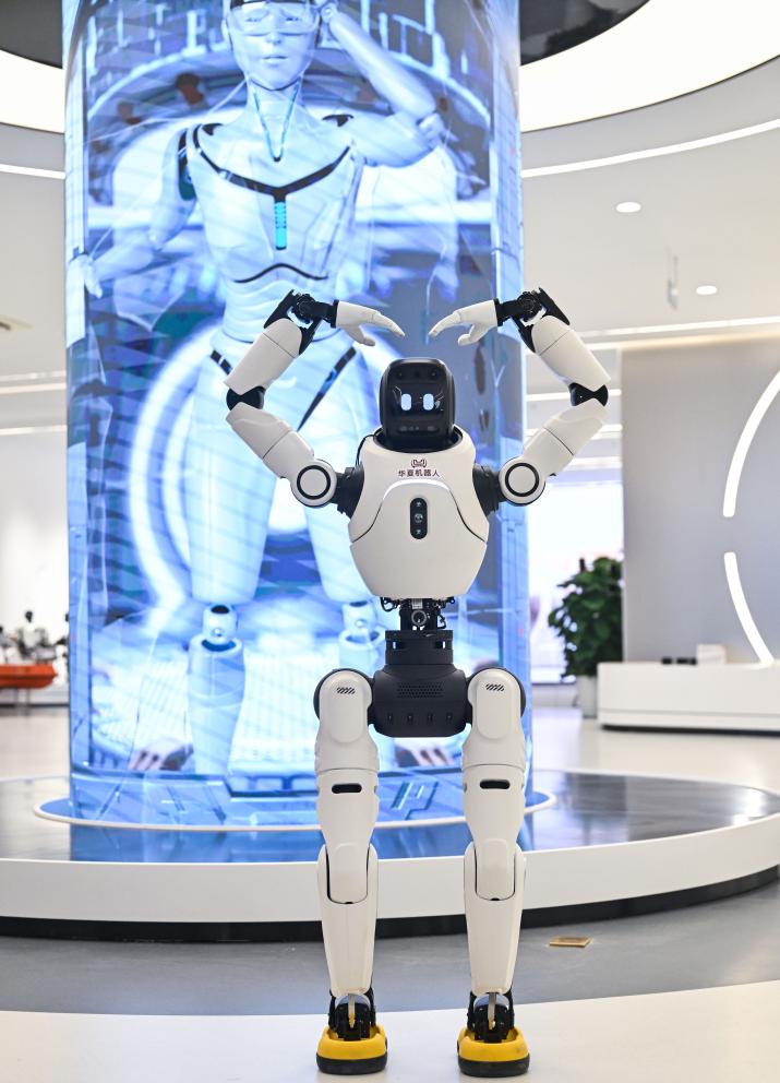 南京人工知能生態街区内の「AI・模坊」南京智能体(インテリジェントエージェント)集散センターで、来場者にあいさつする数字華夏(深圳)科技のロボット。(12月4日撮影、南京=新華社記者/季春鵬)
