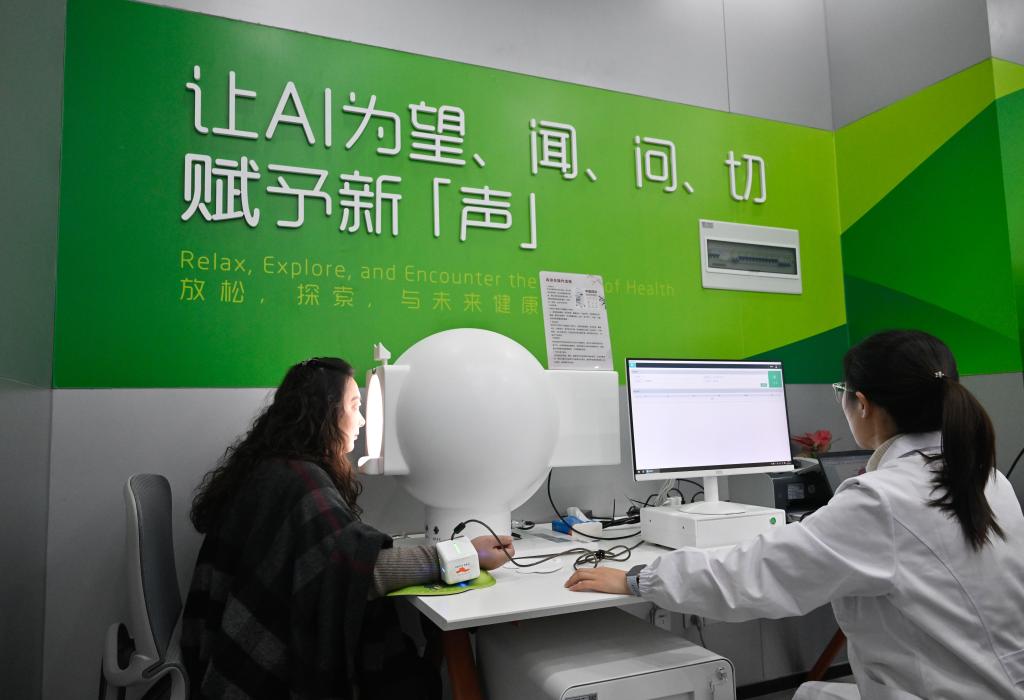 AI・鏡界-南京人工知能生態街区で、「AI診療所」で健康診断を受ける女性。(12月4日撮影、南京=新華社記者/季春鵬)