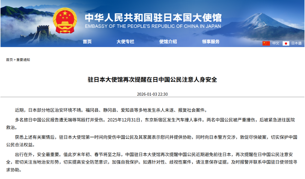 【新華社東京1月4日】在日中国大使館は3日、日本各地で凶悪な事件が相次いで発生しているとして、日本に滞在する中国国民に対し、身の安全に注意するよう呼びかけた。