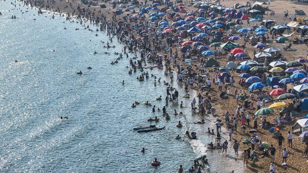 観光客でにぎわう大連傅家荘公園の浜辺。(2025年7月10日、ドローンから、大連=新華社記者/潘昱竜)