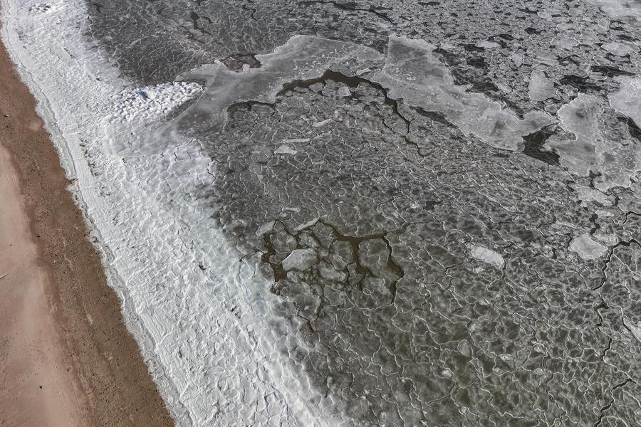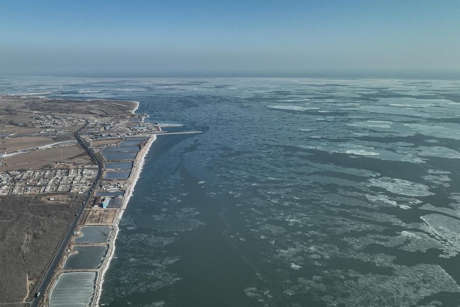21日、遼寧省葫蘆島市興城で撮影した海氷。(ドローンから、葫蘆島=新華社配信/田嘉)