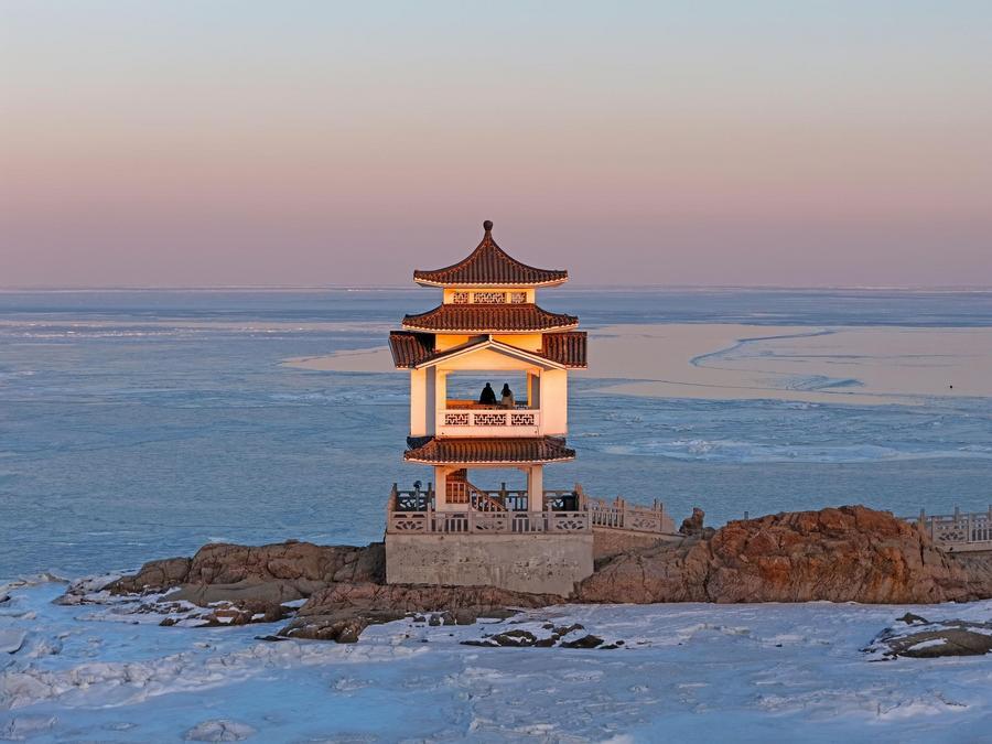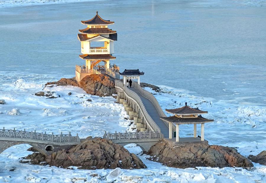 【新華社葫蘆島1月26日】中国遼寧省葫蘆島(ころとう)市付近の海域でこのほど、低温の影響により氷が出現し、独特の景観を形成した。