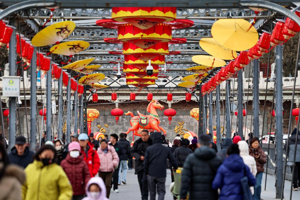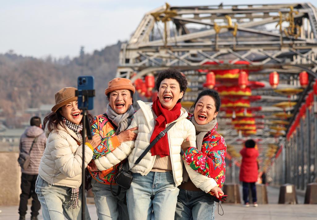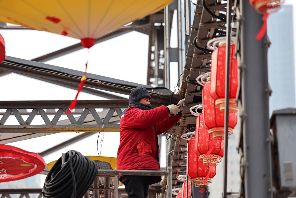 【新華社蘭州2月11日】中国甘粛省蘭州市にある黄河鉄橋の中山橋で、春節(旧正月)に向けた大型の赤いランタンの装飾が施されている。100年以上の歴史を持つこの橋は、今年も新春を迎える活気あふれる雰囲気に包まれている。