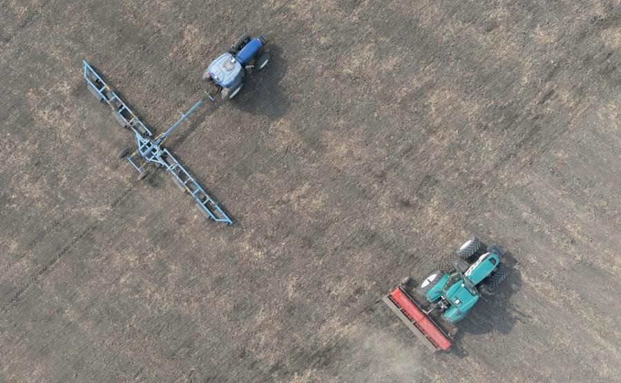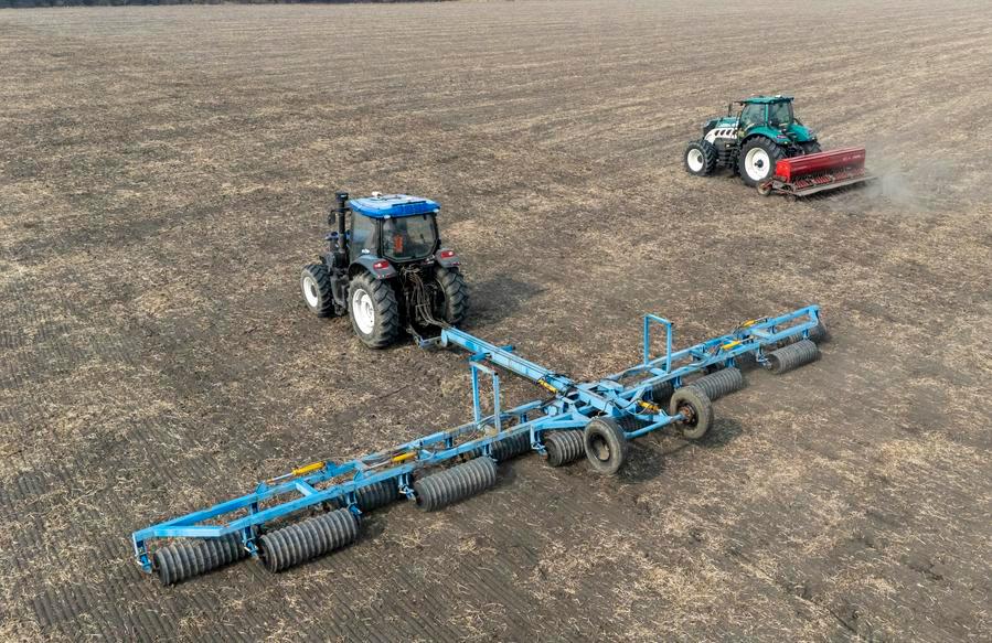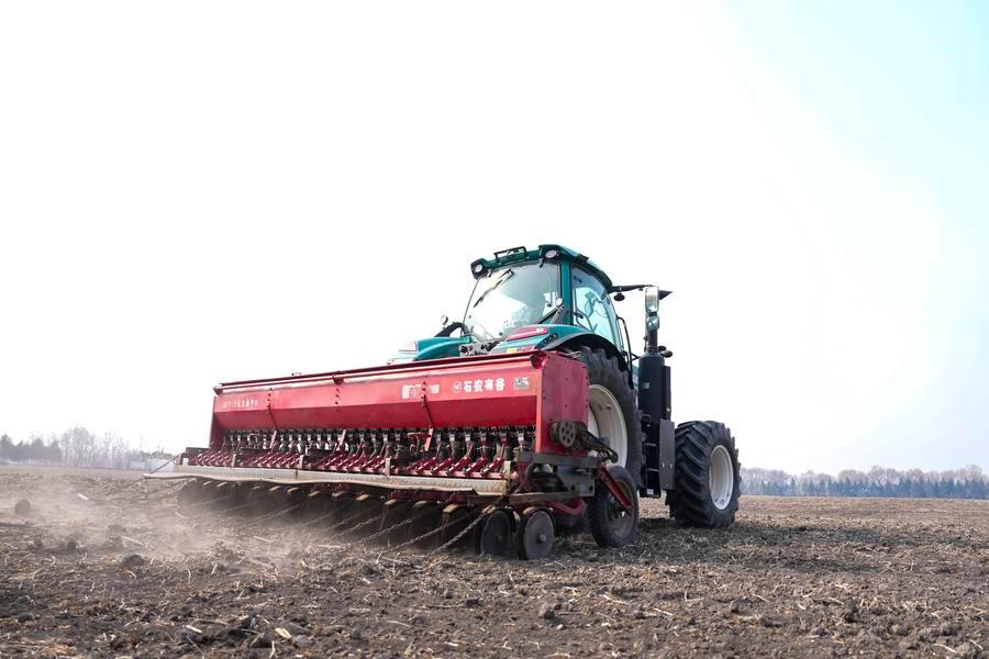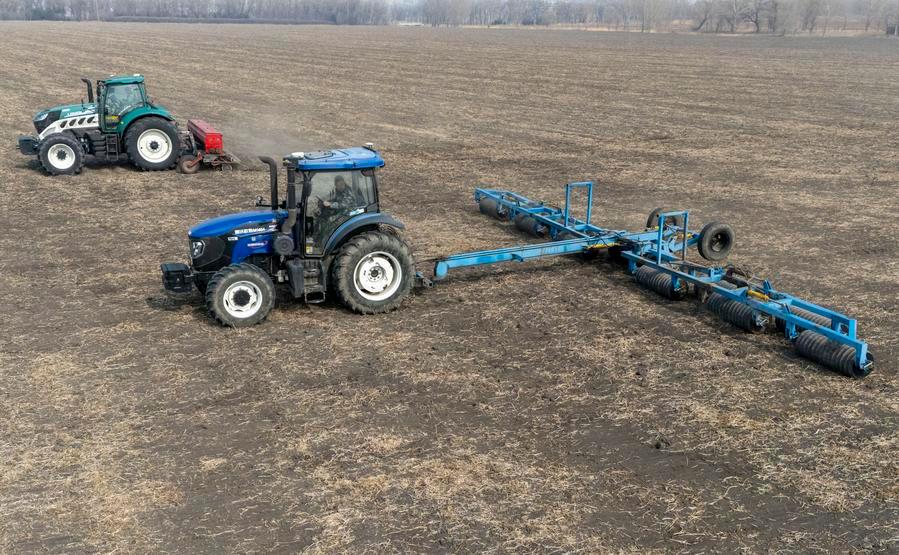 【新華社ハルビン3月31日】中国黒竜江省の一部の開墾地区で、小麦の種まきが進められている。同省ハルビン市にある農業企業、北大荒農墾集団傘下の閆家崗(えんかこう)農場では黒土の上を農機が行き来し、正確に作業しており、403ムー(約27ヘクタール)の種まきが間もなく完了する。