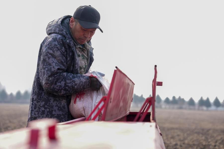 25日、閆家崗農場で、種まき機に小麦の種を投入する農家の人。(ハルビン=新華社記者/王松)