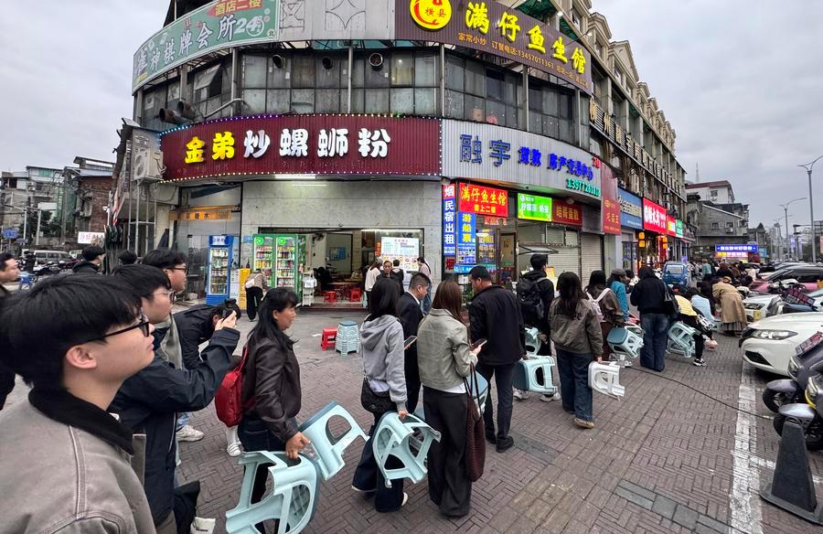 10日、柳州市駕鶴路のタニシビーフン店で「炒めタニシビーフン」を求めて列を作る人たち。(柳州=新華社配信/鄭昌昊)