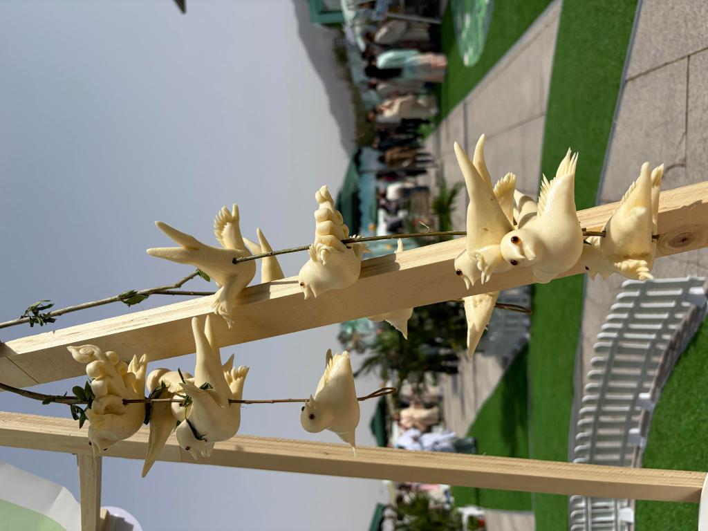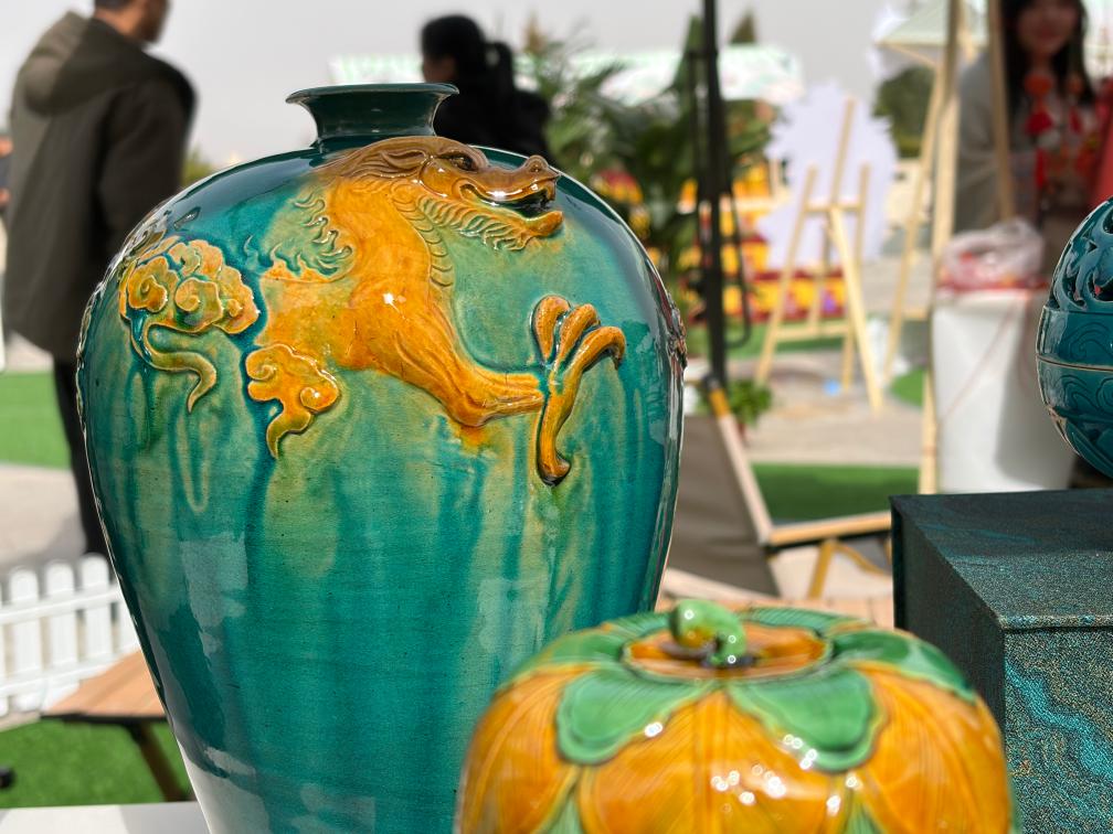3日、介休市の「寒食清明文化祭」で展示された無形文化遺産の琉璃作品。(介休=新華社記者/陳志豪)