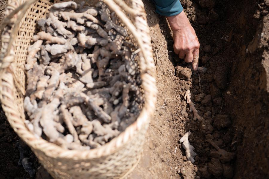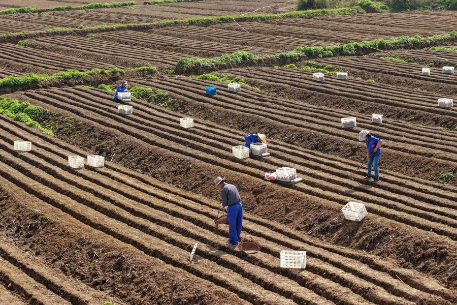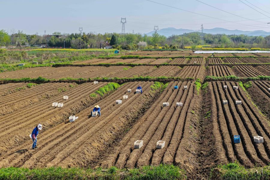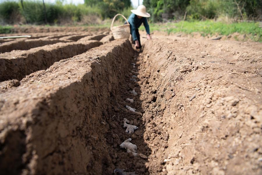 【新華社銅陵4月8日】中国安徽省銅陵市の大通鎮や天門鎮で、特産の白ショウガの植え付けや施肥、棚の設置作業が進み、春の農作業が本格化している。
