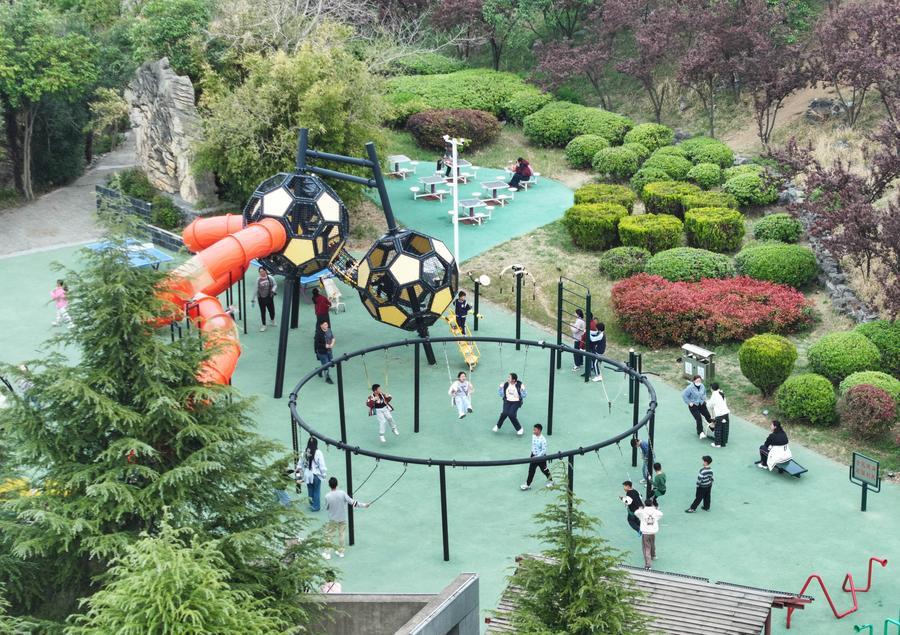3日、淮安市の盱眙象山公園で遊ぶ子ども。(ドローンから、淮安=新華社記者/季春鵬)