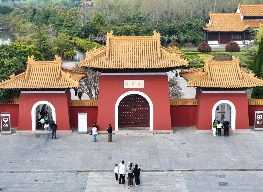 3日、淮安市盱眙県にある国家4A級(5段階の上から2番目)風景区、明祖陵を見学する観光客。(ドローンから、淮安=新華社記者/季春鵬)