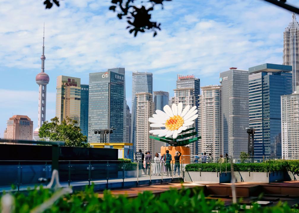 18日、BFC外灘金融センターの屋上テラスに設置された花のオブジェ。(上海=新華社記者/劉穎)