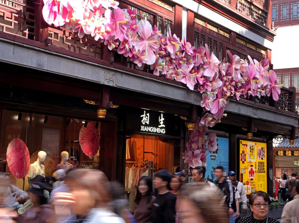 18日、豫園商城に設置された花をモチーフにした装飾。(上海=新華社記者/劉穎)
