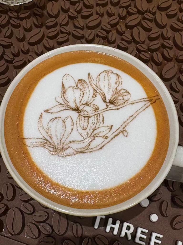 18日、BFC外灘金融センターのカフェで提供されたラテアートでハクモクレンを描いたコーヒー。 (上海=新華社記者/劉穎)